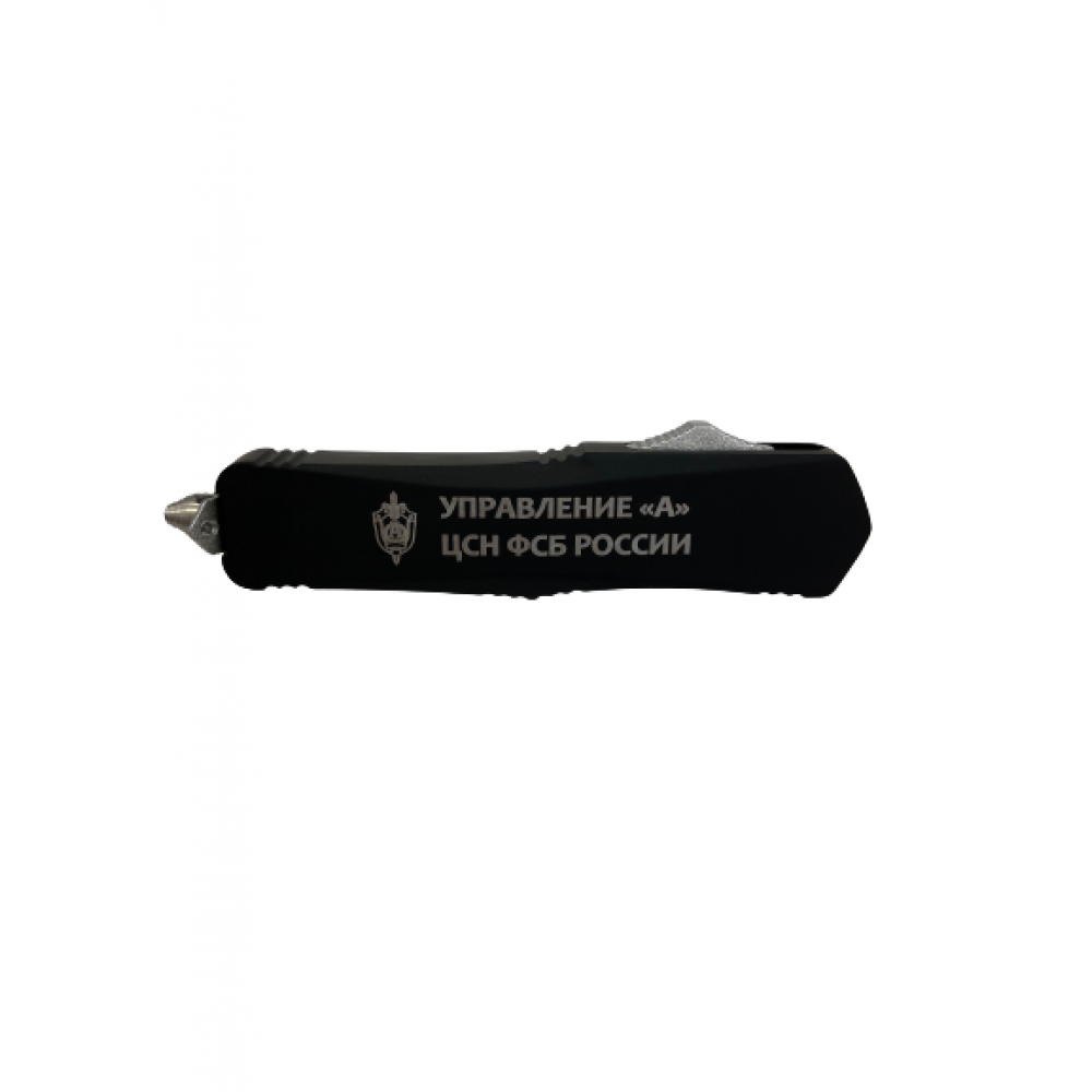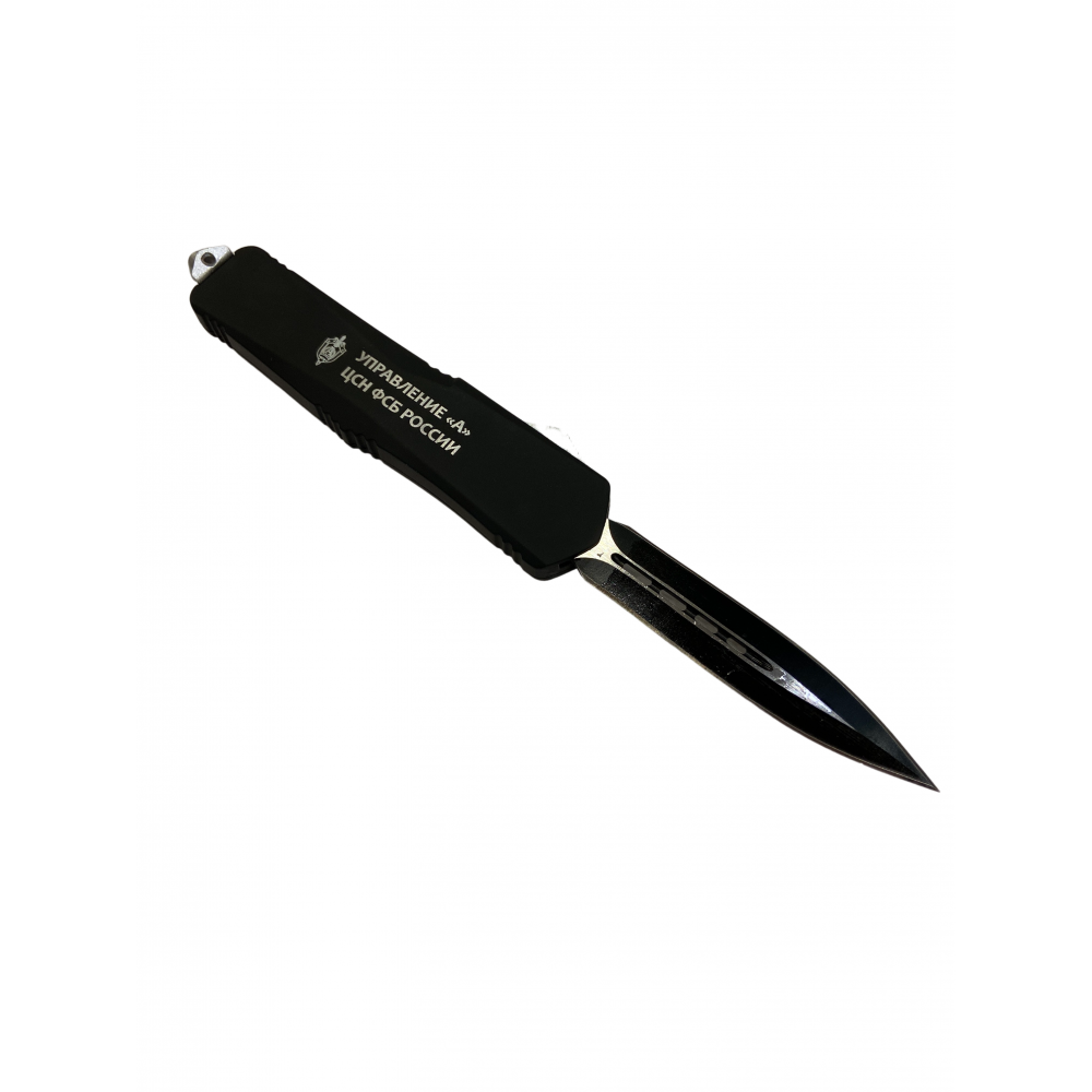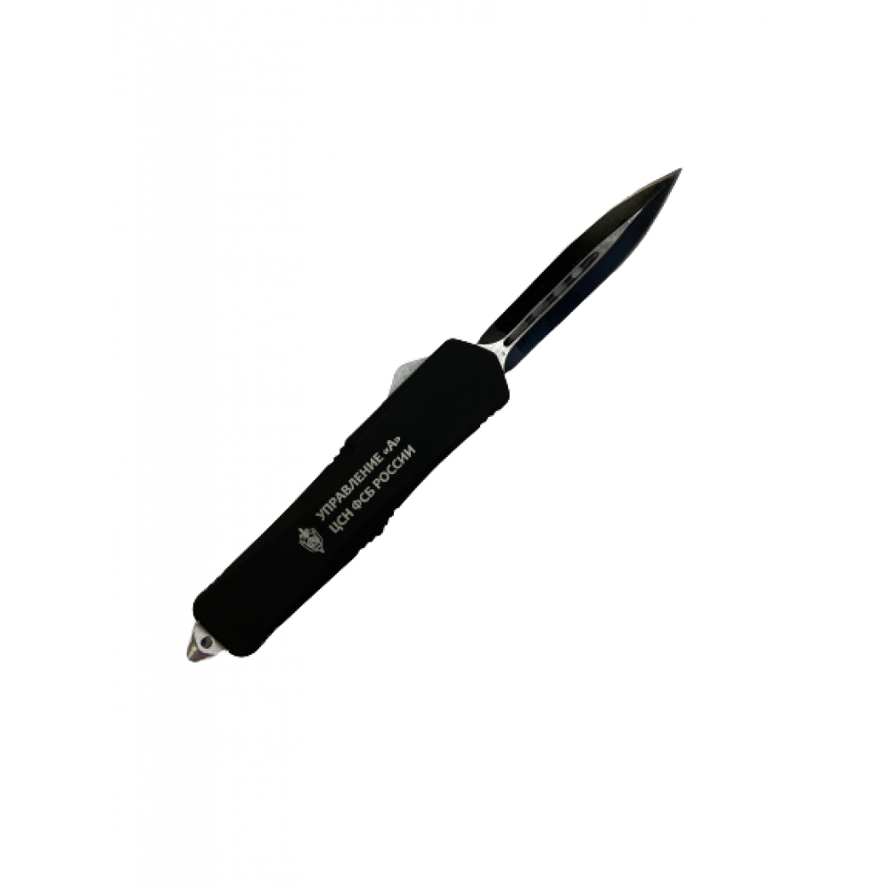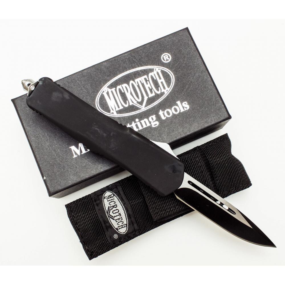 Быстрый фронтальный выброс клинка обеспечивается кнопкой, удобно расположенной под пальцем, после нажатия на которую происходит надежная фиксация лезвия. Автоматический складной нож Microtech фронтального выброса клинка имеет обоюдоострое стальное лезвие, крепкую не скользящую рукоять и клипсу для ношения на поясе или в кармане. Комплект дополнен нейлоновым защитным чехлом. Реплика ножа Microtech (Микротек) – это удачное соединение стильного дизайна и высокой функциональности.